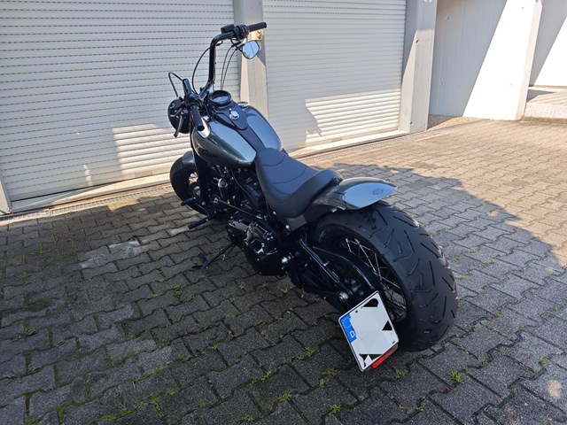 Softail mit 200er Hinterrad im Fat Boy Style auf Basis einer 2015er Slim mit dem bewährten 103er Twin Cam.
